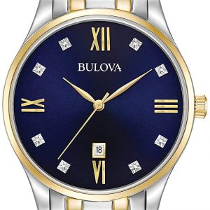 Bulova Men’s Classic Two-Tone Stainless Steel 3-Hand Calendar Date Quartz Watch with Diamonds and Blue Dial Style: 98D130