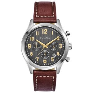Bulova Men’s Classic Stainless Steel Chronograph Quartz Watch, Brown Leather Strap with Gold Tone Arabic Markers, 41mm Style: 96B301