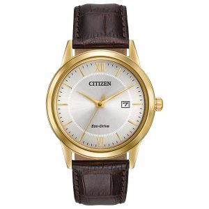 Citizen Men’s Classic Eco-Drive Leather Strap Watch, 3-Hand Date, Luminous Hands and Markers, Brown Strap/ Gold Tone