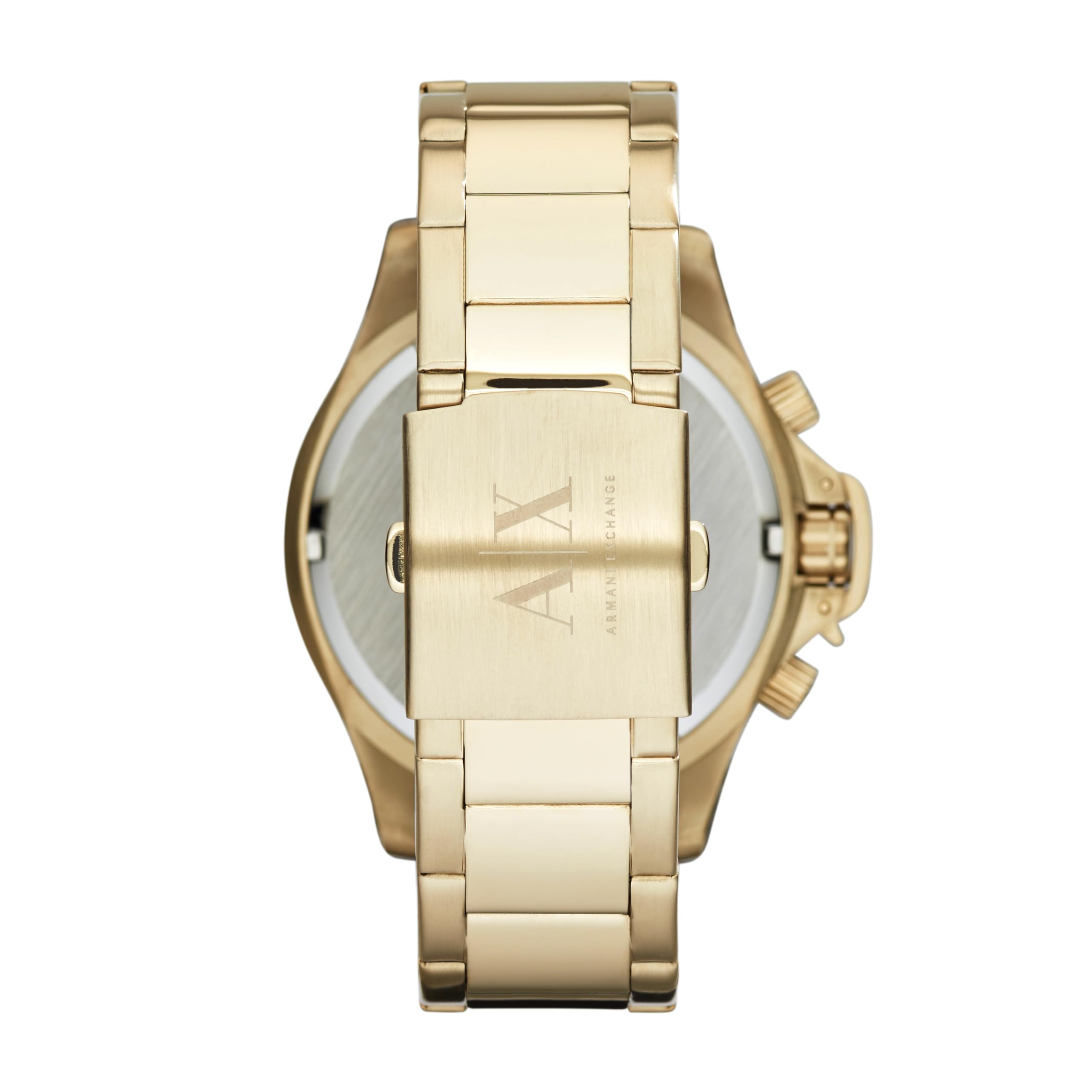 - In this Armani Exchange men’s watch, gold-tone plating makes a stylish statement when paired with a black-plated topring and dial.